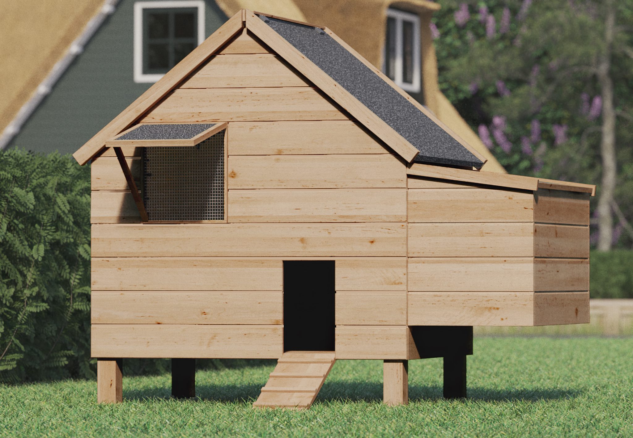 Inclusief binnenhok met scharnierend dak, legnest, zitstok, dakleer en bevestigingsmaterialen