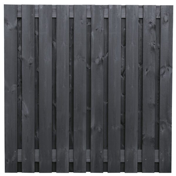 H180xB180cm 19 planken van 1.6×14.0cm tussenregel: 1.6×14.0cm – geschaafd – zwart gespoten grenen – rvs geschroefd